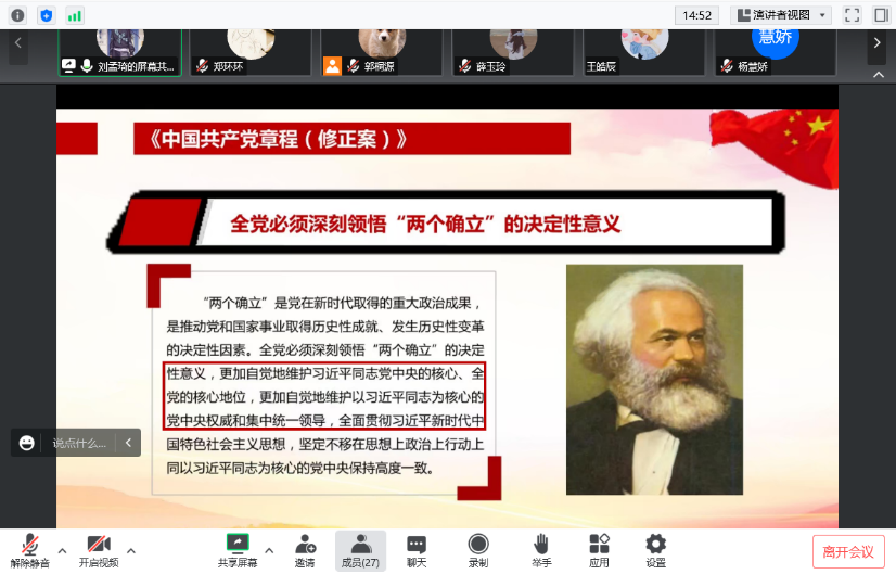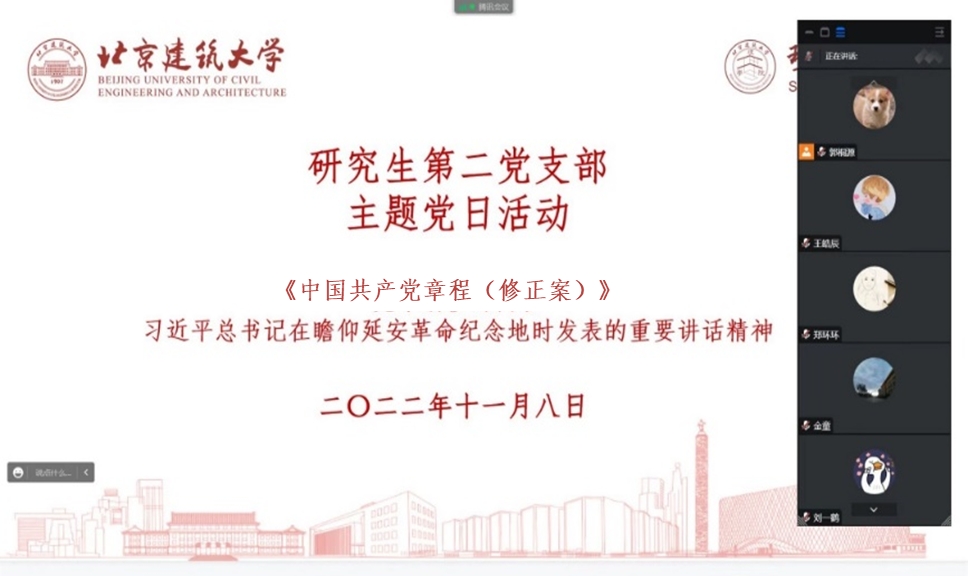 2022年11月8日,淫妻小说 研究生第二党支部开展“学党章 强信念”主题党日活动,重点学习《中国共产党章程(修正案)》和习近平总书记在瞻仰延安革命纪念地时发表的重要讲话精神,全体党员参加了活动。活动以“我来当主讲”的形式开展,党支部书记郑环环进行了现场点评,活动由党支部纪检委员郭桐源主持。