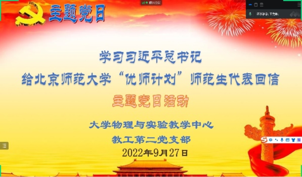 9月27日下午,大学物理与实验教学中心教工第二党支部,在大兴校区基础楼C-509开展学习“习近平总书记对北京师范大学‘优师计划’师范生代表回信精神”的主题党日活动,活动由党支部书记王秀敏主持,全体党员现场进行了学习和分享,学院其他教工党员在线上进行了观摩。