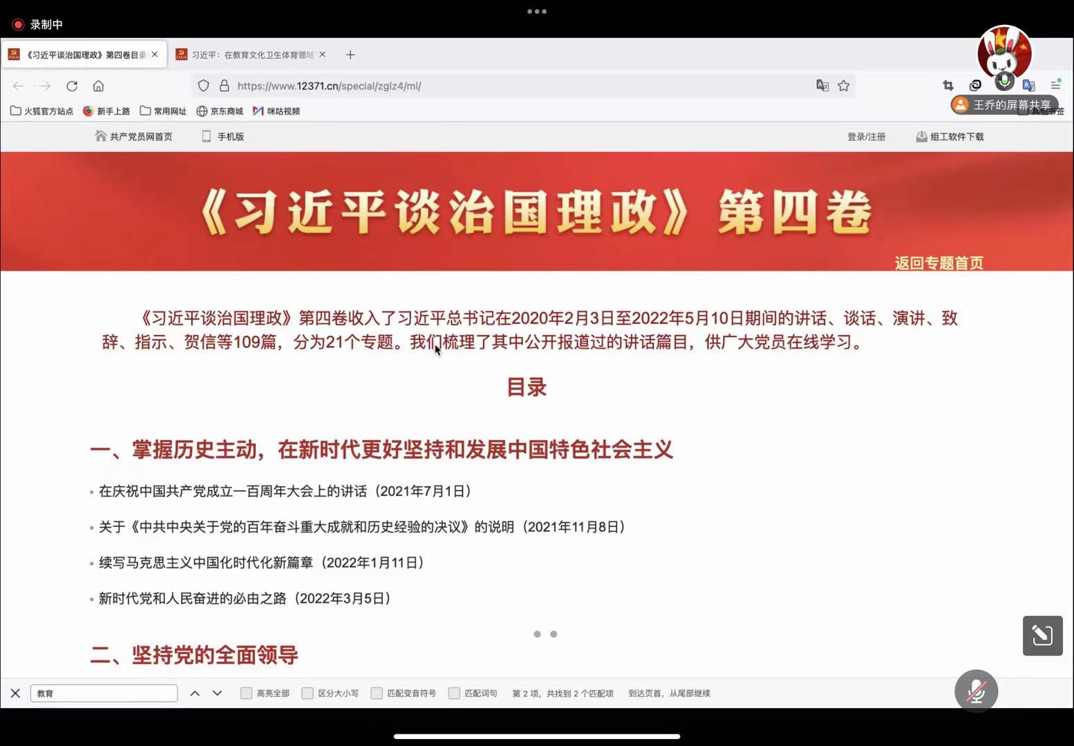 会上由王乔老师介绍了《习近平谈治国理政》第四卷的各专题标题内容,并援引了相关解读材料,使各位党员从宏观上感受到“两个结合”的理论创新,“十个明确”的丰富发展和“三大时代课题”的思考判断。大家一起重温了“庆祝中国共产党成立一百周年大会上的讲话”中的金句,点燃了各位党员去年观看直播时激情澎湃的心情。通过研读“在加快推进教育现代化的新征程中培养担当民族复兴大任的时代新人”,使各位教师党员更加明确了在人才培养和科技创新中高校的角色责任与发展方向。