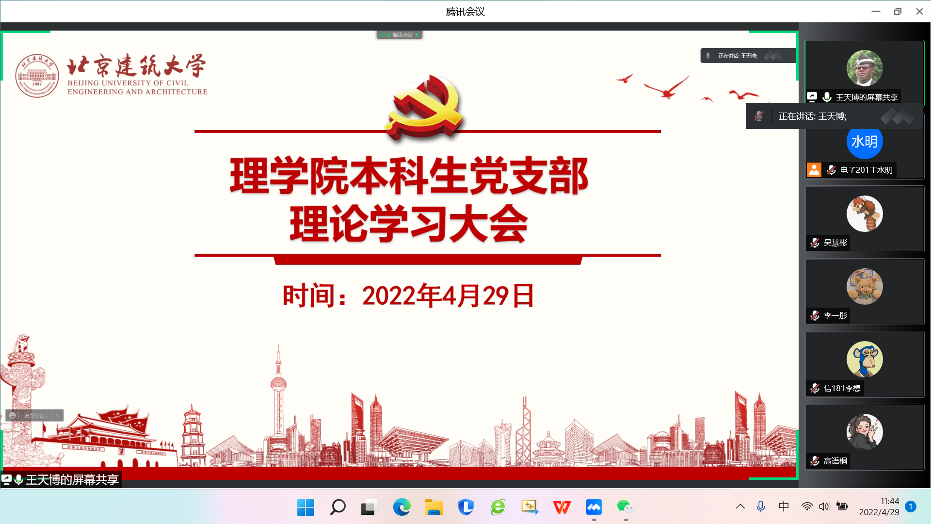 围绕习近平总书记考察中国人民大学的重要讲话,淫妻小说 本科生党支部于4月29日中午在线上召开主题党日活动,全体党员参加,活动由支部书记代云主持。