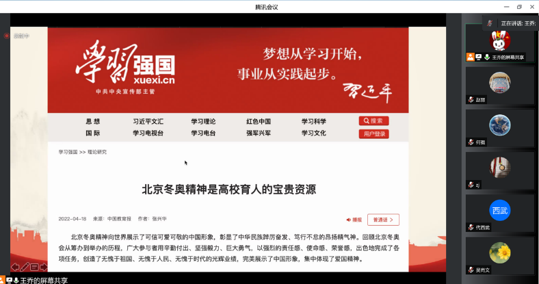 党课以冬奥精神开篇,引用了来源于《中国教育报》的《北京冬奥精神是高校育人的宝贵资源》,从中国气派、中国精神、中国品质和中国风格等方面介绍了博大精深、内涵丰富的北京冬奥精神。通过媒体报道《绽放,剪纸上的冰雪之花》和《冰天雪地里,数万座冬奥临时设施如何抗冻又保暖》形象展示了冬奥精神“更快、更高、更强”的口号。以点带面地分享我校部分二级学院教师团队对冬奥顺利举办所做出的贡献,分享将冬奥精神融入数学课程思政的优秀教学案例,激励大家永远积极向上、追逐梦想、奋勇拼搏。