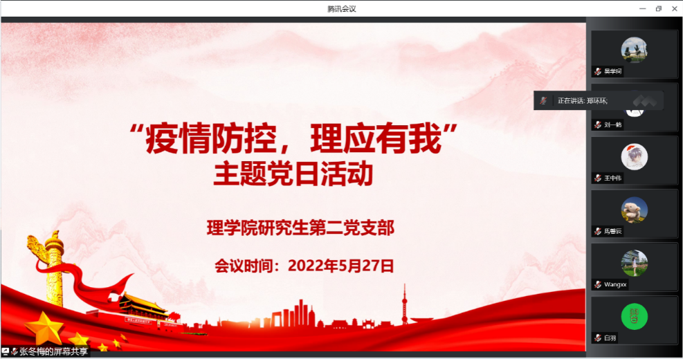5月27日,淫妻小说 研究生第二党支部线上召开“疫情防控,理应有我”主题党日活动,党委书记白羽老师作为联系党支部的院领导参加活动,活动由党支部书记郑环环主持,全体党员参加了活动。