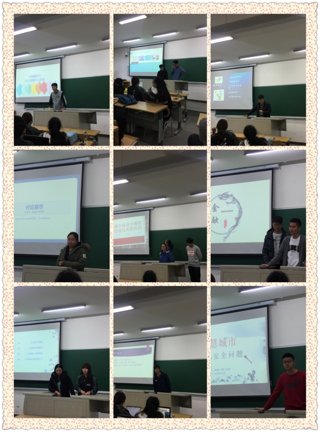 在张老师简短的开白后,第一组同学上台展示他们关于智慧城市的信息与安全问题的讨论成果,说明了安全问题有哪些、这些问题的产生原因和他们所想到的解决方式。紧接着各组同学依次开始展示成果:从最基础的“优秀程序员必备技能”;到直接关系大学生涯定位:“金融和信息与计算科学的联系、数学专业的学生如果继续深造,可以有哪些选择、从工程计算领域看信计专业的发展、大数据时代信计需要什么技能”;更拓展到了在中国腾飞的大背景下,信计专业的前景与定位“智慧城市建设中图形图像处理技术的应用、智慧城市建设和信息与计算科学的关系、人工智能时代我们能做什么”。同学们汇报展示丰富多彩,充满了对自己专业未来的自信,生动地描绘出了信息与计算科学发展的无限前景。