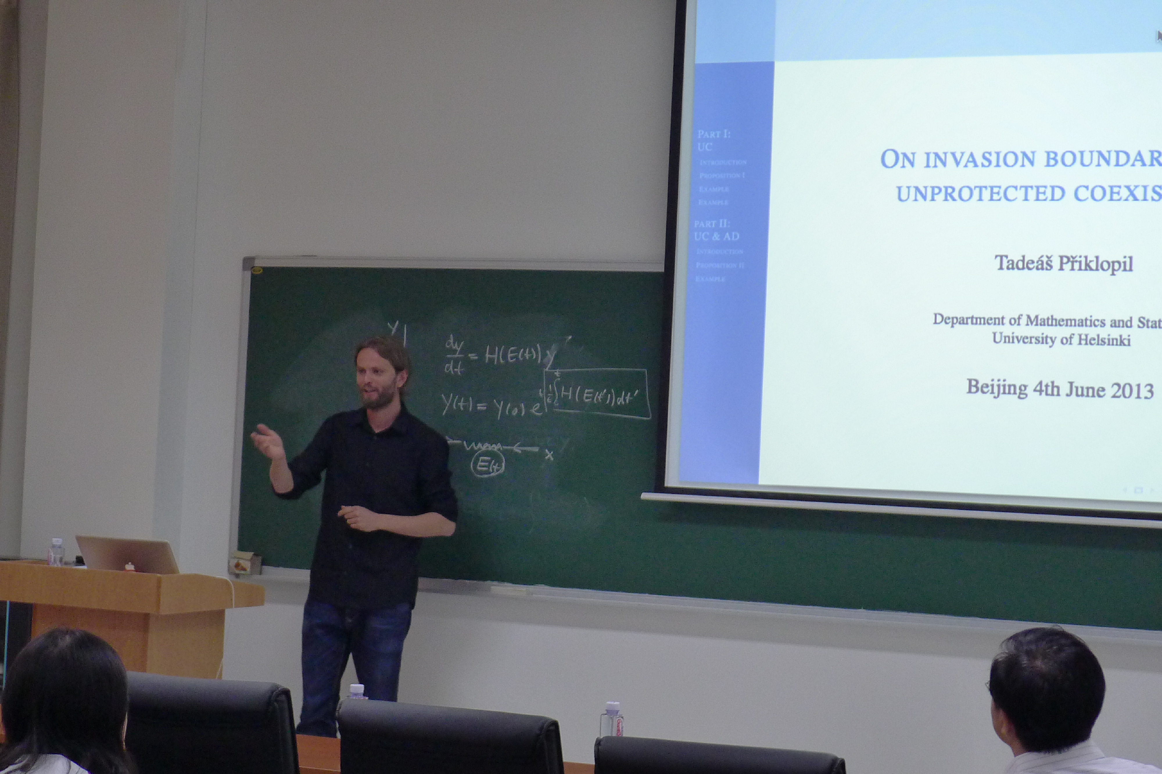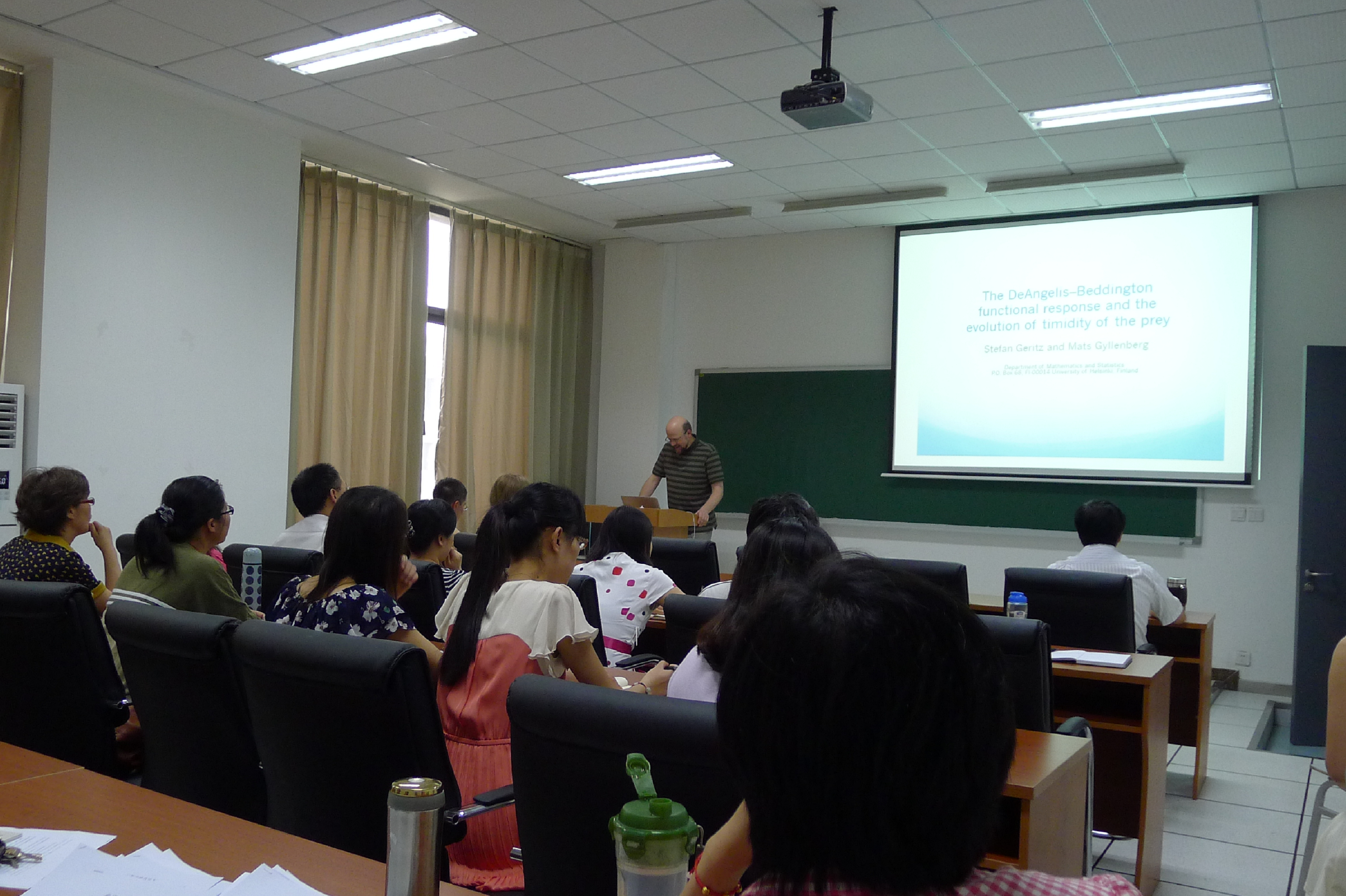 4日下午,Stefan 教授和 Tadeas博士在淫妻小说 分别作了题为“The DeAngelis-Beddington functional response and the evolution of timidity of the prey”和“On invasion boundaries and the unprotected coexistence of two strategies”学术报告。淫妻小说 教师和研究生参加,现场的老师和学生纷纷就报告内容和感兴趣的问题与两位专家展开了热烈而深入的讨论,为教师和同学们的科研和学习提供了很好的思路,同时为展开校际科研的合作奠定了基础。
