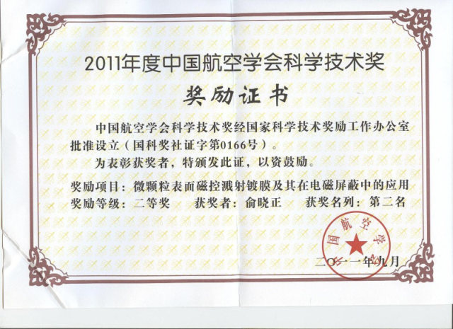 俞晓正副教授获2011年中国航空学会科学技术二等奖