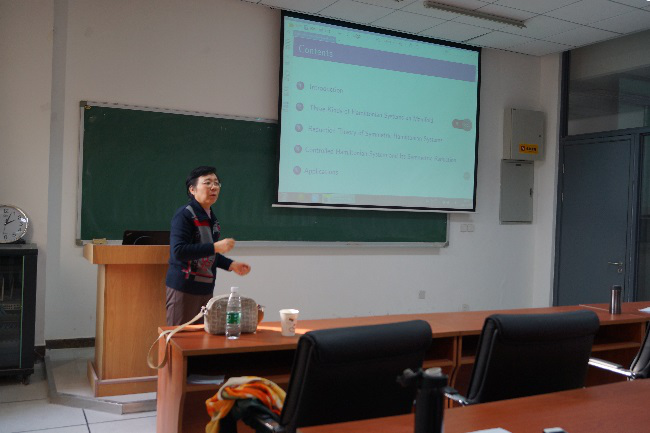 王教授长期从事微分几何研究,作了题为“Geometric Mechanics and Control”的学术报告。Hamiltonian约化理论是现代微分几何研究中最活跃的课题之一,学者们利用该理论得出了许多有深度且完美的结果。王教授阐述了近年来Hamiltonian约化理论系统在对称和控制方面的发展情况,以及将这一理论应用在研究中取得的最新成果。