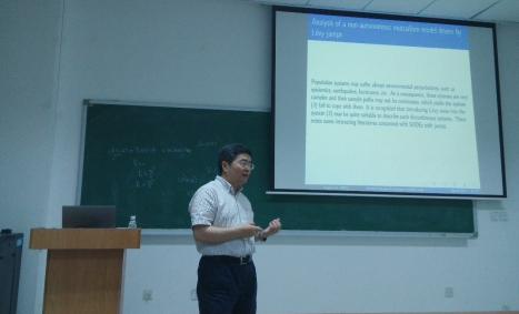 高教授作了题为“Asymptotic behavior of a stochastic mutualism model”的学术报告,对一类互惠模型在Gauss和Levy噪声驱动下的渐进性质分别进行了分析,详细介绍了相关结论的证明过程。与会师生和高教授就随机微分方程相关问题展开了热烈的讨论,高教授还鼓励在座的研究生可以继续这方面的研究工作。通过此次交流,师生们了解了学术前沿动态,也为双方今后开展进一步的合作研究打下了基础。