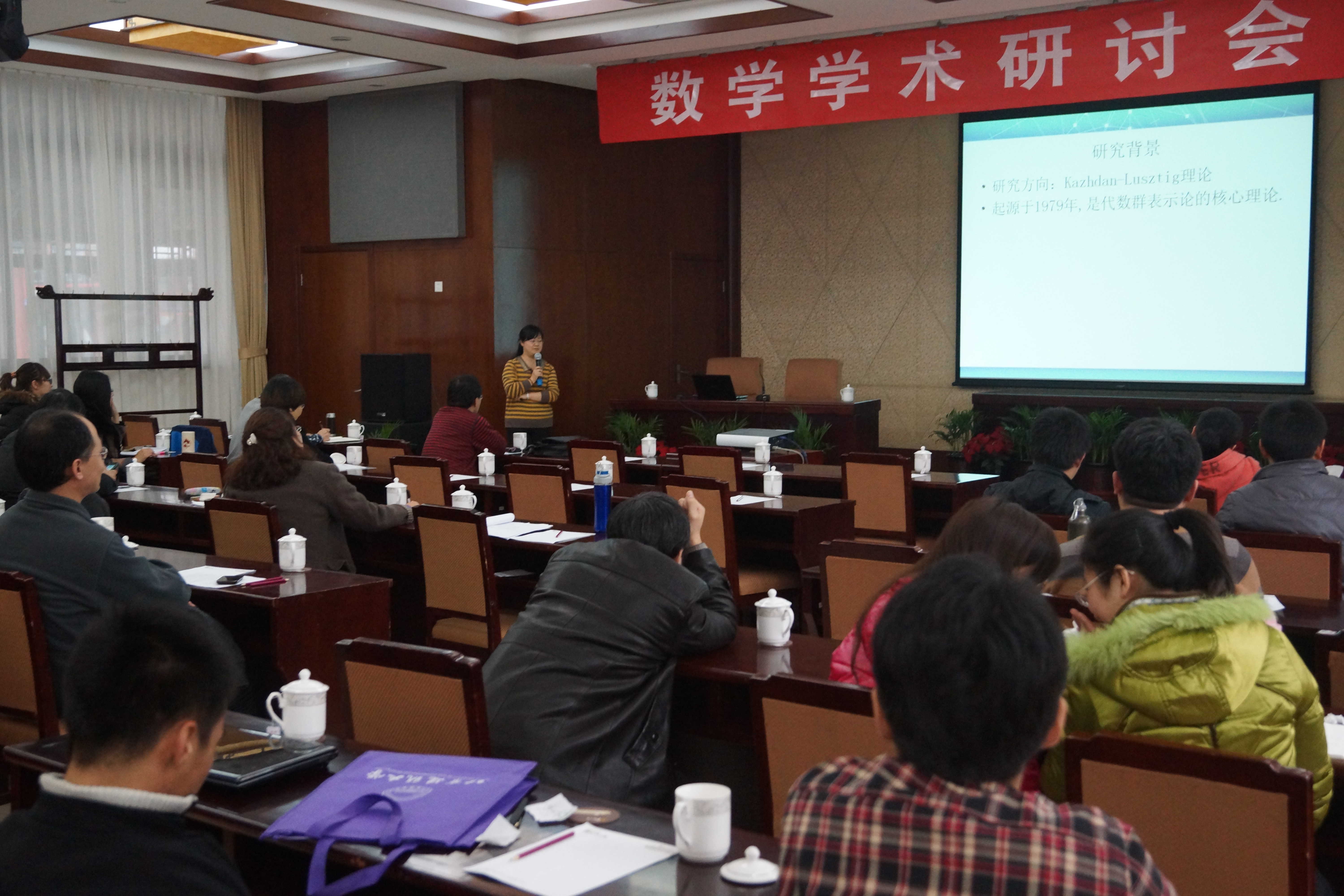 最后,王利萍博士以“Kazhdan-Lusztig多项式的首相系数”为题,介绍了该领域的研究背景、进展、近几年的个人主要研究成果三大方面,王博士首先对D.Kazhdan和G. Lusztig两位数学家进行了介绍,使师生们对该领了有了基本的认识,也为报告奠定了基础,得到师生们的极大认可。