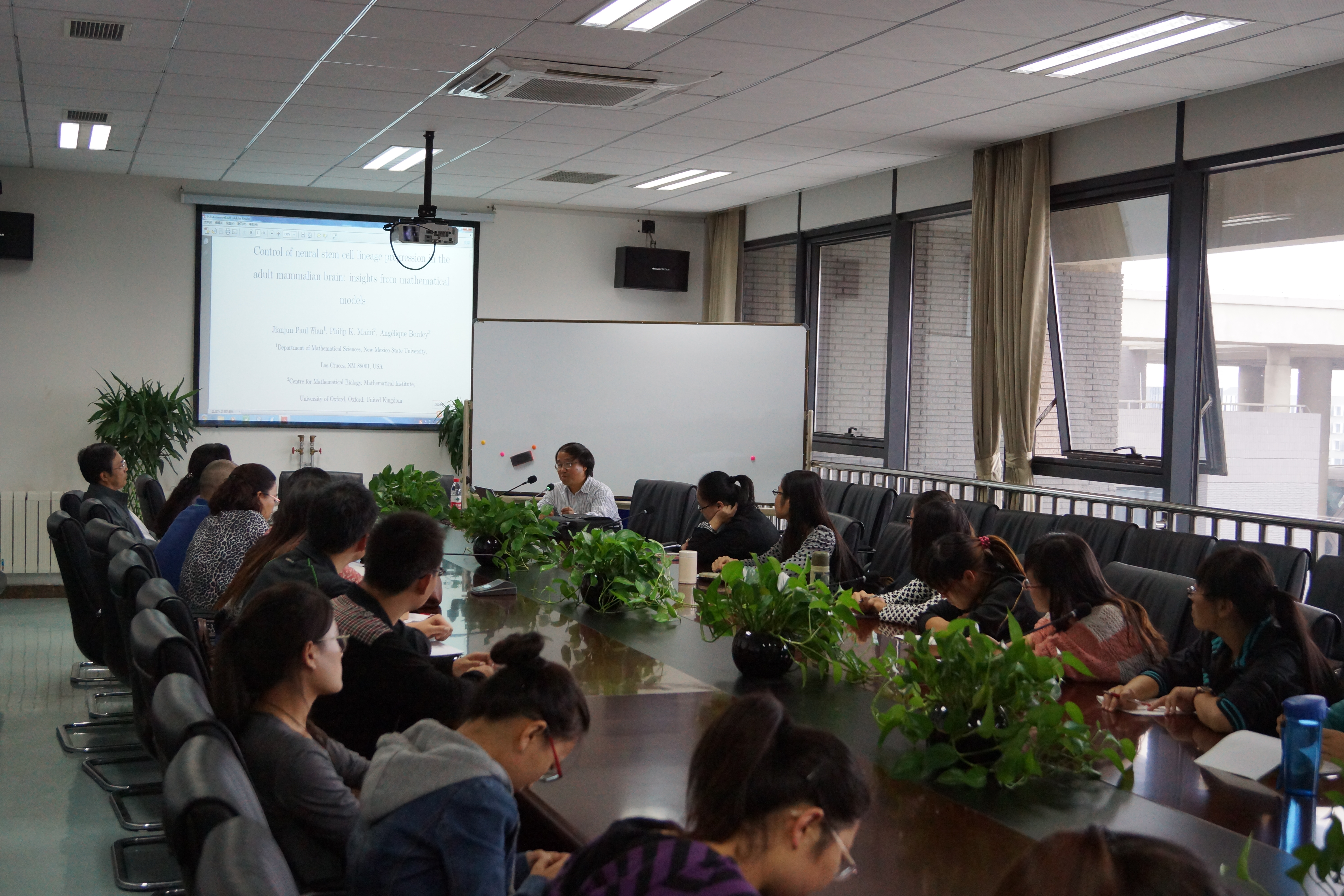 田教授以“Control of neural stem cell lineage progression in the adult mammalian brain: insights from Mathematical models(关于成年哺乳动物大脑的神经干细胞系的发展控制的数学模型的研究)”和“Stochastic models in population biology(种群生物学中的随机模型)”为主题,详细报告了相关实际问题的动力学建模及定性理论与数值分析,与大家分享了如何发现和解决科学问题并循序渐进地开展科研工作。田教授还就与我校共同培养研究生事宜等跟大家进行了交流,鼓励研究生和年轻老师走出去开阔眼界,拓宽知识面和提高自身数学素养。