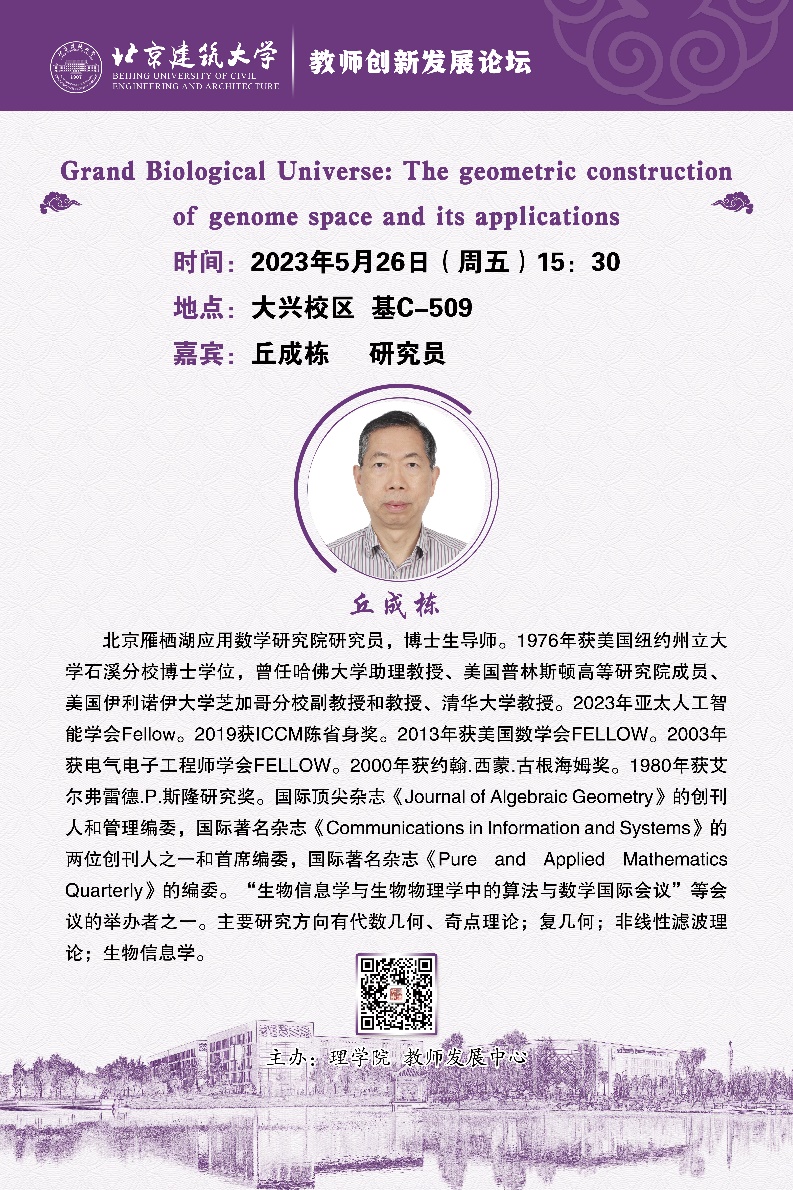 5月26日下午,应淫妻小说 与学校教师发展中心邀请,国际著名数学家、北京雁栖湖应用数学研究院研究员丘成栋教授莅临我校,做了题为“Grand Biological Universe: The geometric construction of genome space and its applications”即“大生物宇宙:基因组空间几何结构及其应用”的精彩报告。