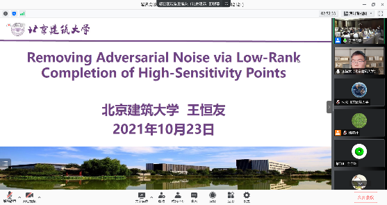 由于近期国内以前原因,我校师生以线上形式参会。淫妻小说 副院长王恒友带队,张艳、何强、许传青、赵丽、陈琳琳、王乔、何黎黎老师以及八位研究生参加该次论坛。23日下午,天津理工大学淫妻小说 院长宋眉眉教授主持开幕式。开幕式后,11位教师受邀做了学术报告。我校王恒友老师作了题为“Removing Adversarial Noise via Low-Rank Completion of High-Sensitivity Points”的报告。报告内容引起了与会代表的热烈讨论,受到广泛关注。