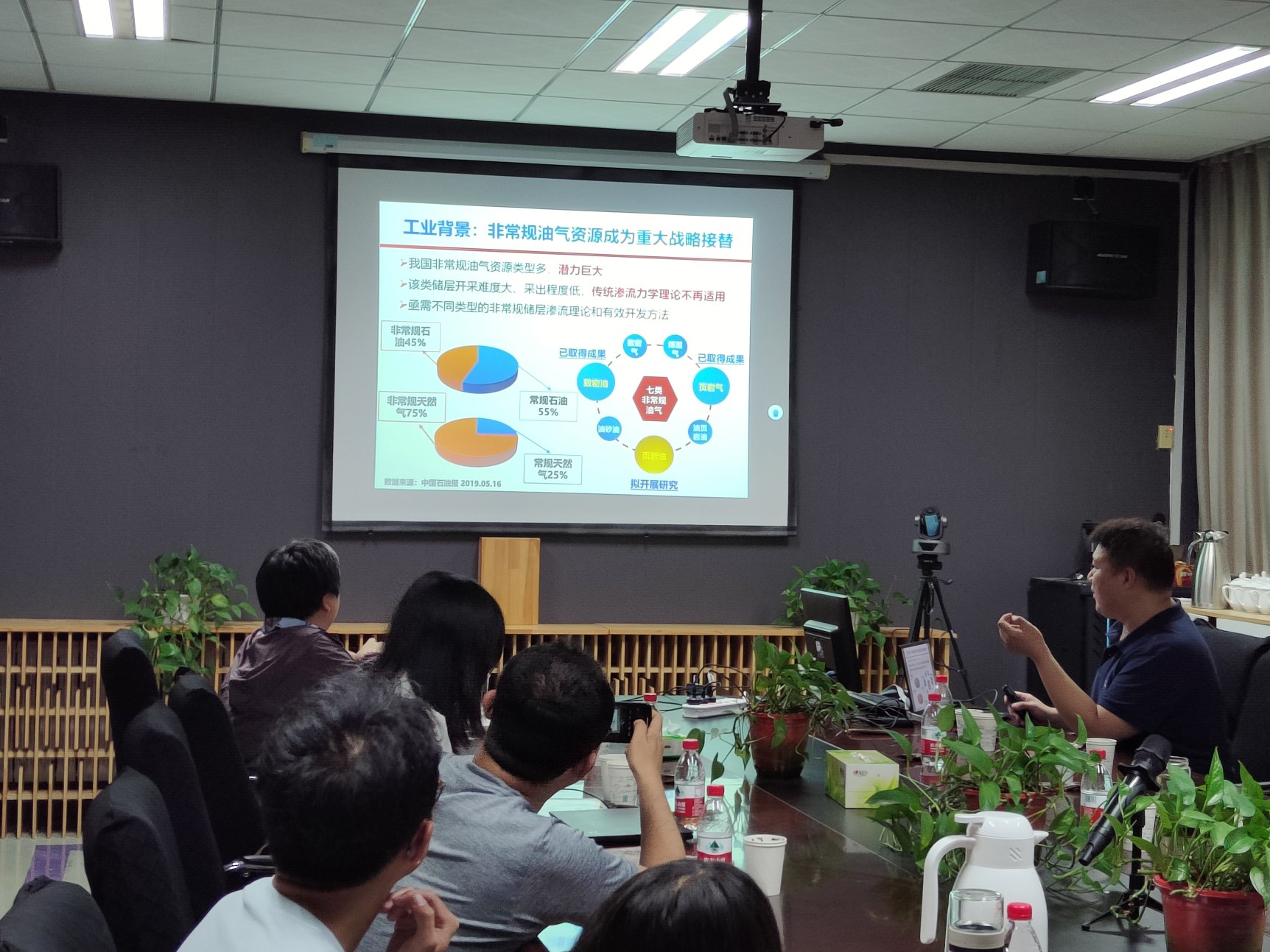 之后宋洪庆教授作了了题为《非常规油气藏开发的物理与数据模型》的报告,介绍了特低渗透油藏非达西渗流理论研究及其应用,解释了非达西渗流与达西渗流的区别与联系,包括有无启动压力的区别以及模型建立中的差异。另外宋教授还介绍了致密气渗流机理及模型、煤气层水两相非线性模型、页岩气多尺度流动模拟及产能预测方法,最后介绍了数智流体力学这一未来流体力学发展趋势。