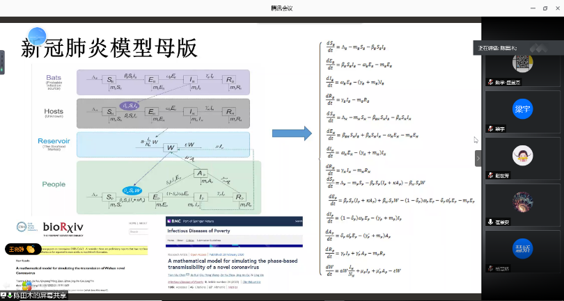陈老师首先介绍了新冠肺炎疫情的基本情况,接着详细阐述了新冠肺炎传播动力学模型的构建以及对于不同模型的模拟与分析等,最后讲解了有关年龄分组的新冠模型,评估了干预措施对疫情传播的影响。报告结束后,陈老师耐心详细地解答了参会师生提出的问题,并和大家展开了热烈的讨论。