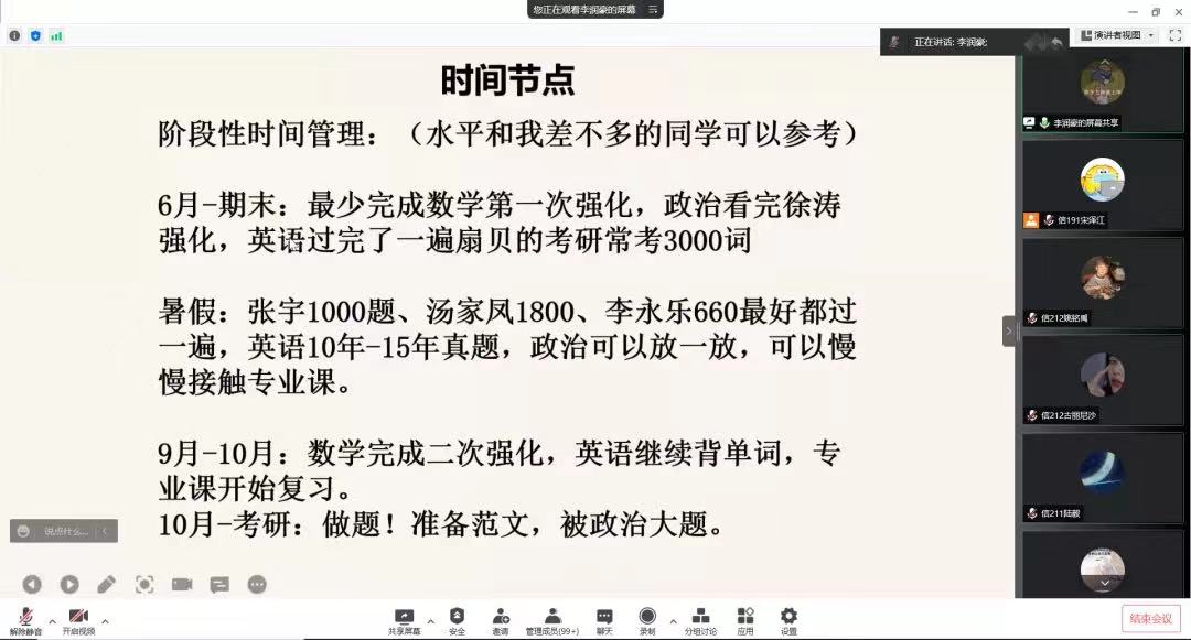 王恒友老师围绕学院研究生招生工作,对同学们夯实学科基础、提高综合素质等给予了建议,并希望同学们理性选择报考院校及专业,静心学习、细心积累、耐心备考。参会的班主任老师从专业课学习、心理状态等角度,给予了同学们相关建议,并希望同学们不负韶华、不负时光、不负青春,为考研做足准备,预祝大家考研顺利。