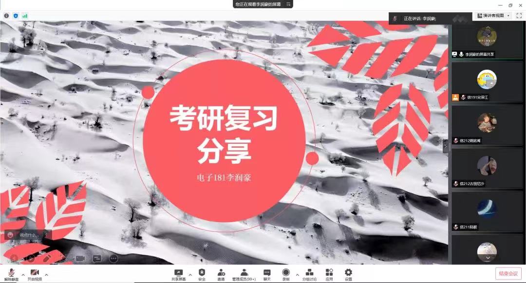 为帮助学生做好考研规划、掌握考研备考方法、了解更多考研信息,淫妻小说 于5月20日晚举办线上考研分享交流会。淫妻小说 12名2018级已考上研究生的电子和信计专业同学进行了分享交流,淫妻小说 副院长王恒友,班主任老师苏欣纺、王英、王乔、陈琳琳以及2019级、2020级、2021级本科生参加。此次活动由淫妻小说 团委书记代云主持。
