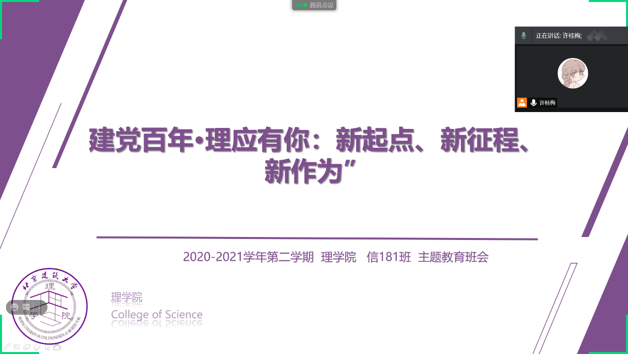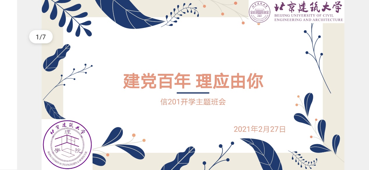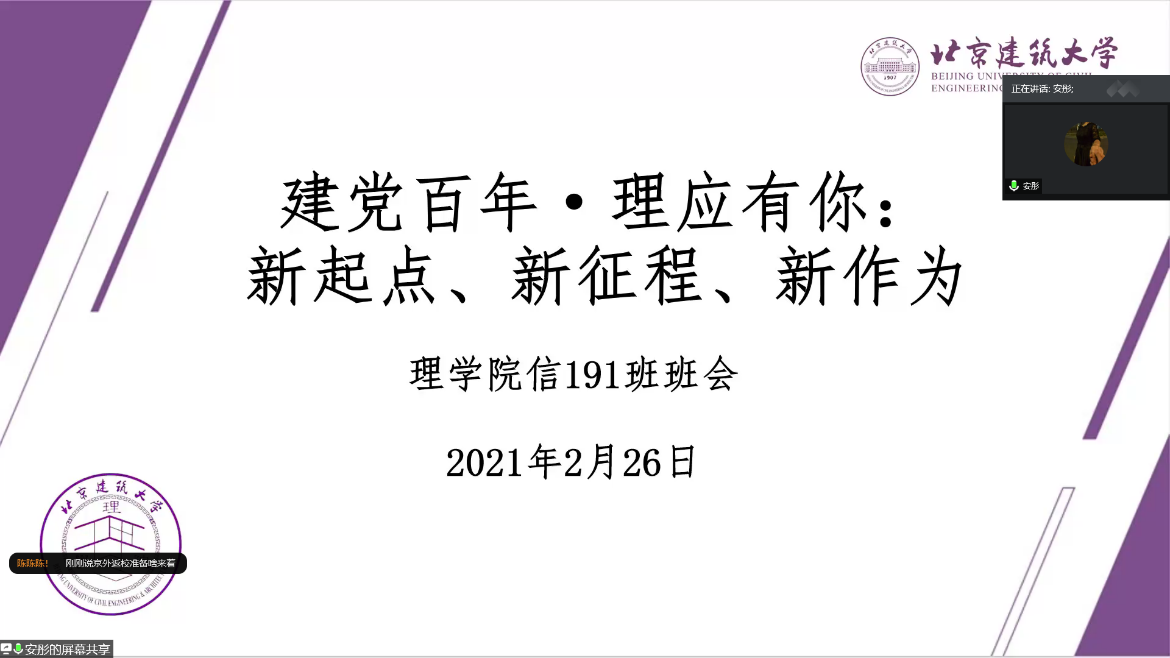 11个班级于2月28日前召开了新学期【建党百年·“理”应有你:新起点、新征程、新作为】主题班会。2021年是建党100周年,同学们围绕建党百年主题集体学习党史相关知识;对2021年春季学期返校安排及疫情防控等方面事宜进行了沟通并围绕新学期前三周的线上学习、论文设计及就业准备等工作进行交流;最后,同学们对新学期的学习、工作及生活计划进行了展望,同学们纷纷表示以饱满的热情和期待迎接新的起点,开启新征程,主动作为,争做德智体美劳全面发展的社会主义建设者和和接班人。