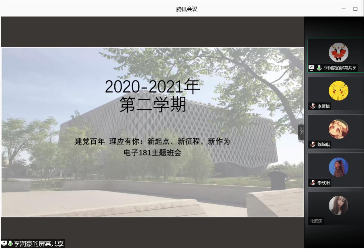 在电子181班的班会中,首先同学们围绕新学期线上学习安排及开学注意事项等进行了沟通和交流。接着,同学们针对在新的一年里个人就业及考研等事宜进行规划和交流。此外,本周为学雷锋活动周,同学们围绕雷锋精神以及如何从个人做起践行雷锋精神进行了主题分享。班会的最后,同学们表示要为实现中华民族伟大复兴贡献青春力量,以优异成绩迎接建党100周年。