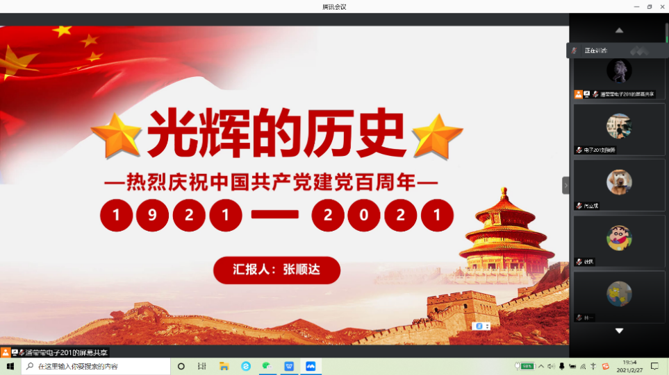 首先,电子191班同学,围绕习近平总书记就建党100周年发表的重要讲话进行了专题学习和讨论,并且针对寒假期间开展的“五个一”活动进行了心得体会分享。接着,在本次主题班会中,同学们认真学习了党的历史以及建党百年我国取得的辉煌成就,以及党的十四五规划和社会主义现代化国家建设的路径。班会的最后,同学们一致认识到,中国特色社会主义伟大事业,必须坚持党的领导,必须以党的十九大精神和习近平新时代中国特色社会主义思想为理论依据和行动指南。