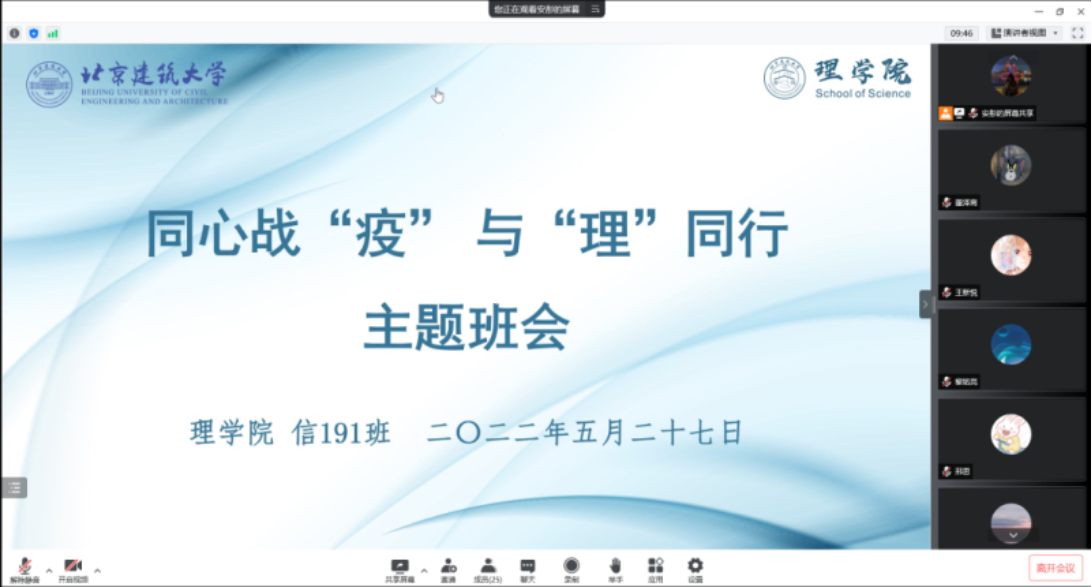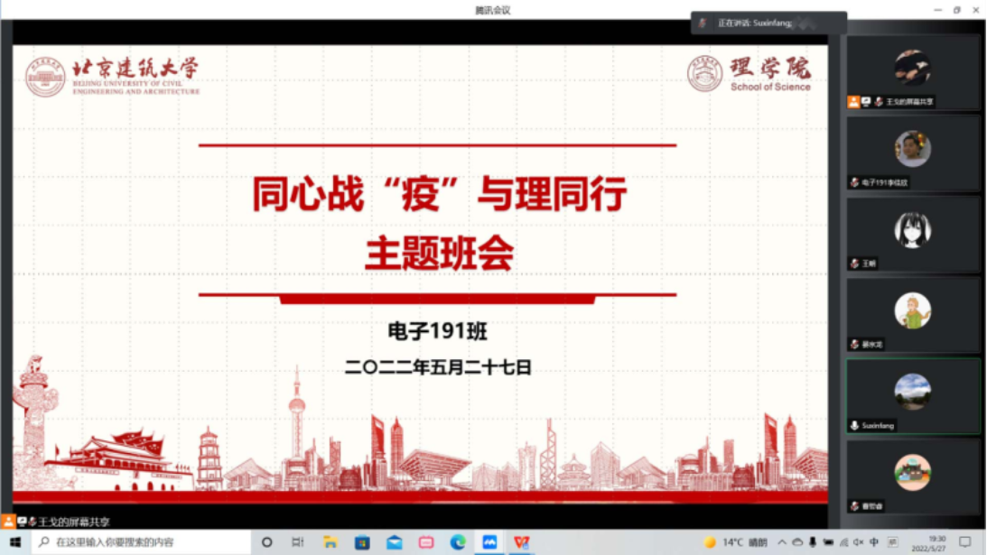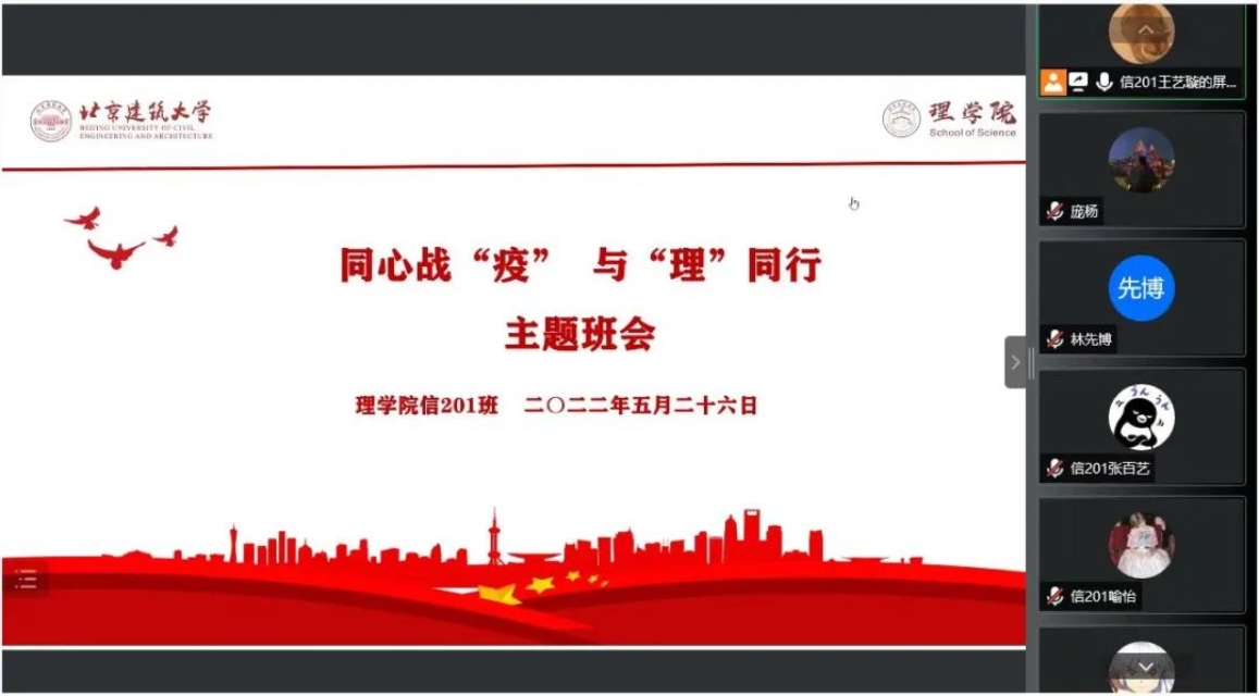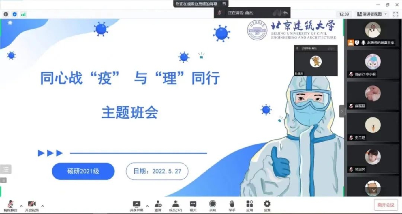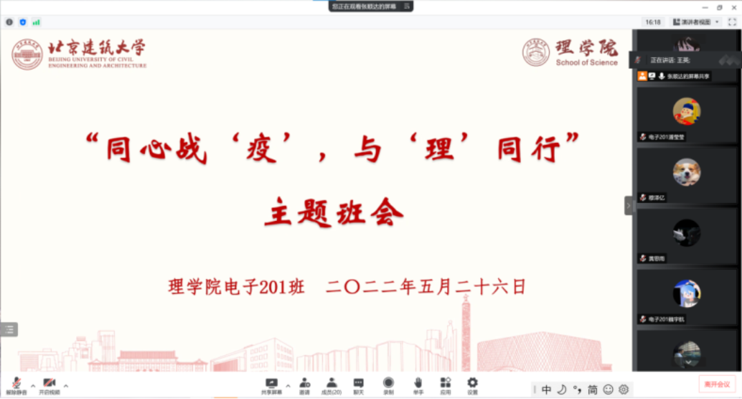 在主题班会中,同学们围绕居家学习、毕业设计(论文)、考研复习、心理状态、思想困惑、身体状况、日常生活等方面分享发言,以及结合自己身临其境感受到的坚守疫情防控一线人们的辛苦奉献和默默付出,参加活动的老师们都给予耐心的聆听、有效的回应、积极的肯定和相关的建议。同学们在分享自己所思所感的过程中,起到了朋辈群体的互帮互助和促进帮扶作用,聚焦重点问题、解决共性问题、研判个性问题,守望相助、同心战“疫”。