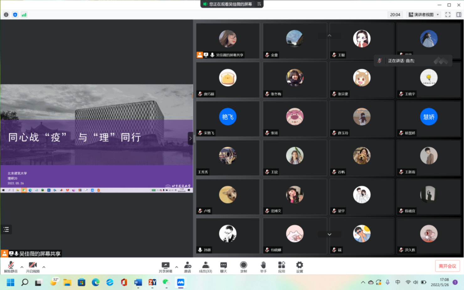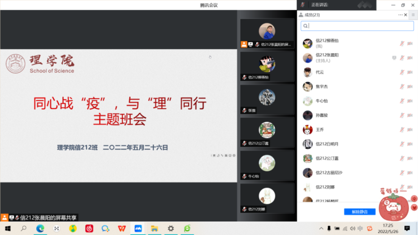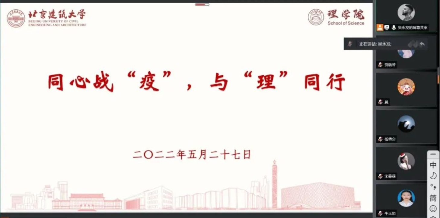 在主题班会中,同学们围绕居家学习、毕业设计(论文)、考研复习、心理状态、思想困惑、身体状况、日常生活等方面分享发言,以及结合自己身临其境感受到的坚守疫情防控一线人们的辛苦奉献和默默付出,参加活动的老师们都给予耐心的聆听、有效的回应、积极的肯定和相关的建议。同学们在分享自己所思所感的过程中,起到了朋辈群体的互帮互助和促进帮扶作用,聚焦重点问题、解决共性问题、研判个性问题,守望相助、同心战“疫”。