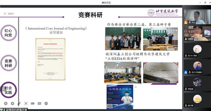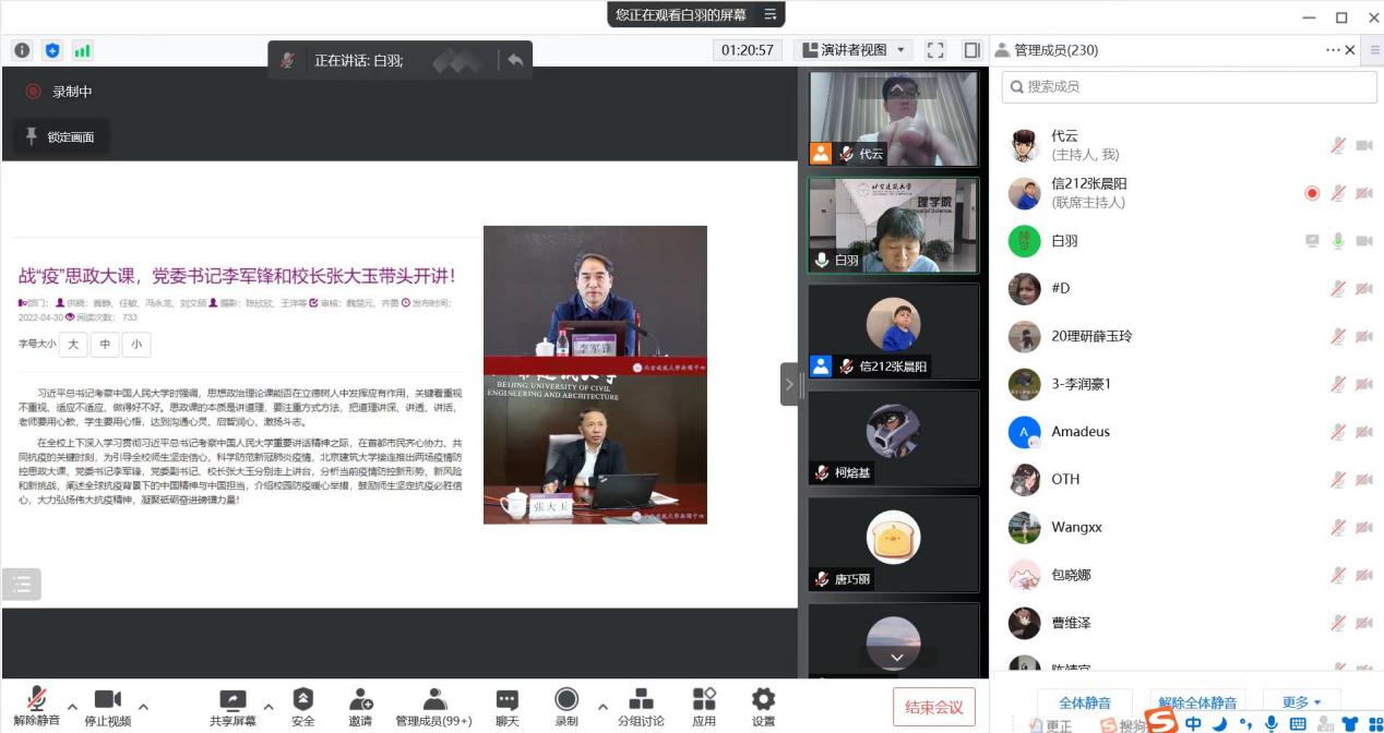 接着,师生们共同学习了习近平总书记在中国人民大学考察时的重要讲话精神。荣获2022年建大青春榜样“自强奉献之星”王戈、“创新实践之星”梁博荣、“党员模范之星”晏京龙三名同学围绕习近平总书记讲话精神进行主题发言。他们从个人学习科研、志愿服务、学科竞赛、社会实践等方面讲述了自己的经历和体会,并分享了在建党100周年庆祝大会、北京2022年冬(残)奥会的所思所感。“微光成炬、向光而行”,他们以实际行动讲述了“不负韶华、不负时代,勤于学习、敏于求知”的动人故事,激励着同学们努力掌握科学文化知识和专业技能,树立远大理想信念、立足民族复兴使命,在青春的赛道上奋力奔跑、绽放耀眼的青春之光。