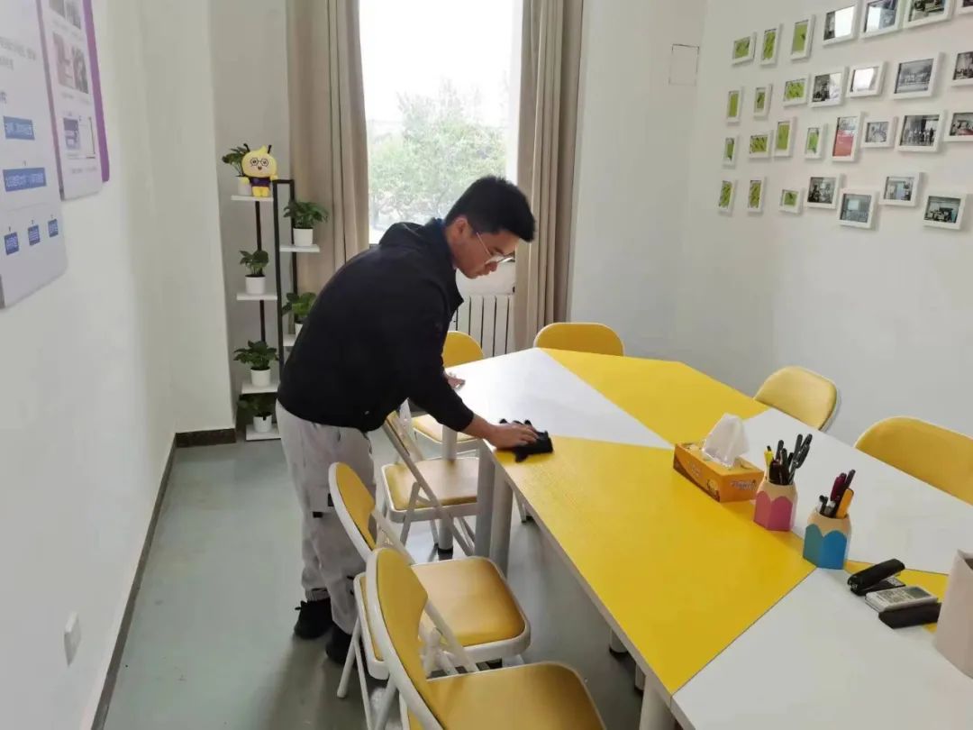 学生活动场所为同学日常开展学生活动的重要场地,为学生开展日常活动、存放学生活动物品等,因使用较为频繁、物品较多,可能会存在卫生和安全隐患。通过劳动活动,同学们踊跃提供清洁思路,合理利用空间,在劳动在实现自我教育,自觉养成良好的卫生习惯和安全意识等。经过大家共同的努力,学生活动场地地面和桌面整洁如初。同学们看着劳动的成果,致力于能够今后为其他同学提供一个良好整洁的活动环境,纷纷露出开心的笑容、非常高兴,体会到乐于奉献的价值和劳动的意义。