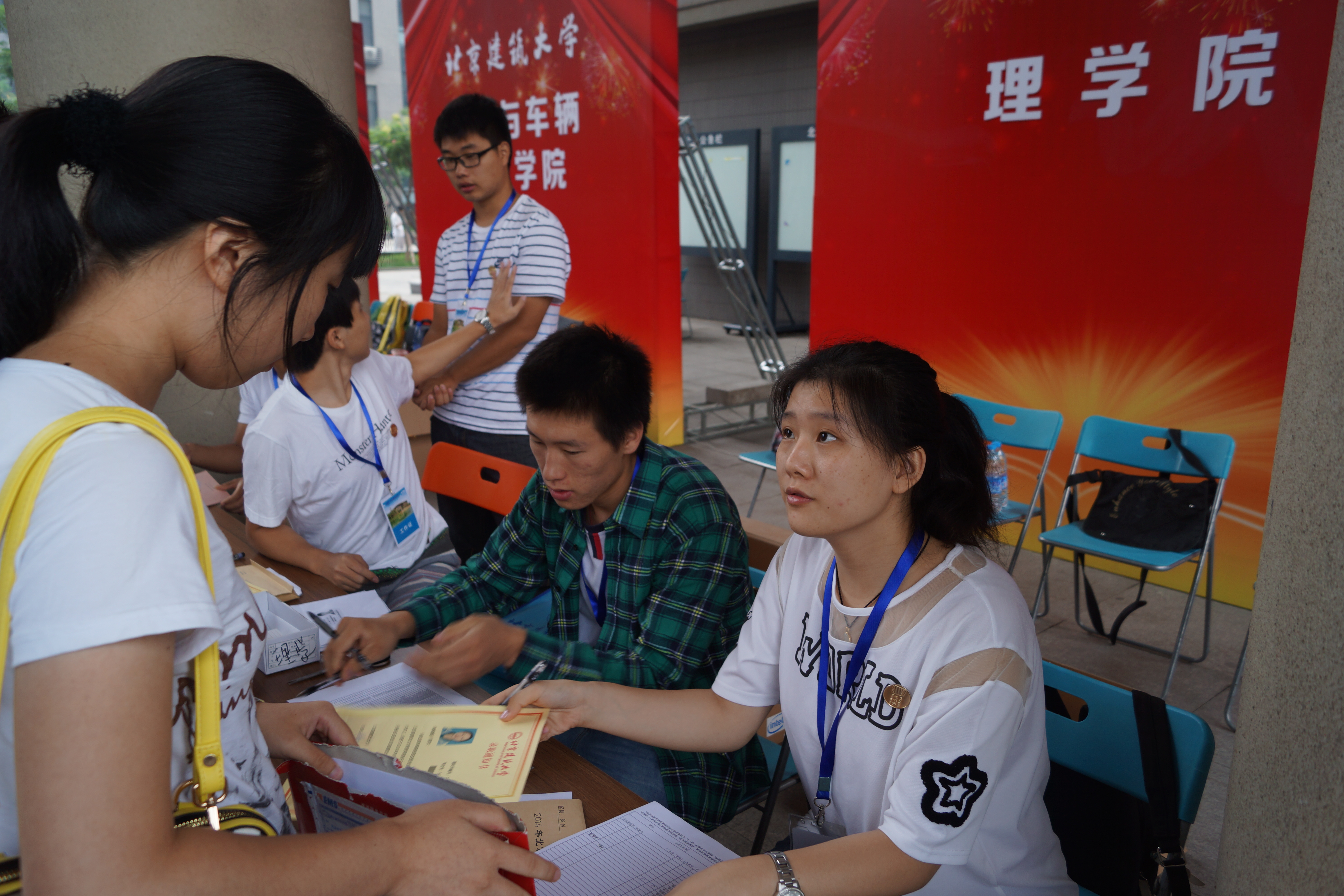 志愿者们早早的来到基础楼A座中央大厅准备,等候新生的到来。为了让新生及其家长能尽快融入北建大这个新环境,我院提前着手布置迎新准备工作,对新生引导和安排流程进行了统一规范,并专门制作了精致的展板和精美的宣传册,对新生入学近期日程安排、学校周边环境、生活细节等作出了温馨提示,使得新生及家长们能够在报到第一时间了解到学校的基本情况。报到过程中,志愿者们细心的接待每一位新生,带他们登记报道,领学生卡,并指引到宿舍区域。途中,志愿者仔细地为新生和家长们解答问题,并为他们介绍我们学校以及在校应注意的问题。面对新生众多的询问,志愿者始终微笑着给他们讲解在学习和生活中应注意的问题,让他们能更快的适应大学生活。在迎新工作开展的期间,院领导、班主任老师们都亲临报到现场指导了相关的工作,使迎新工作有条不紊的进行。