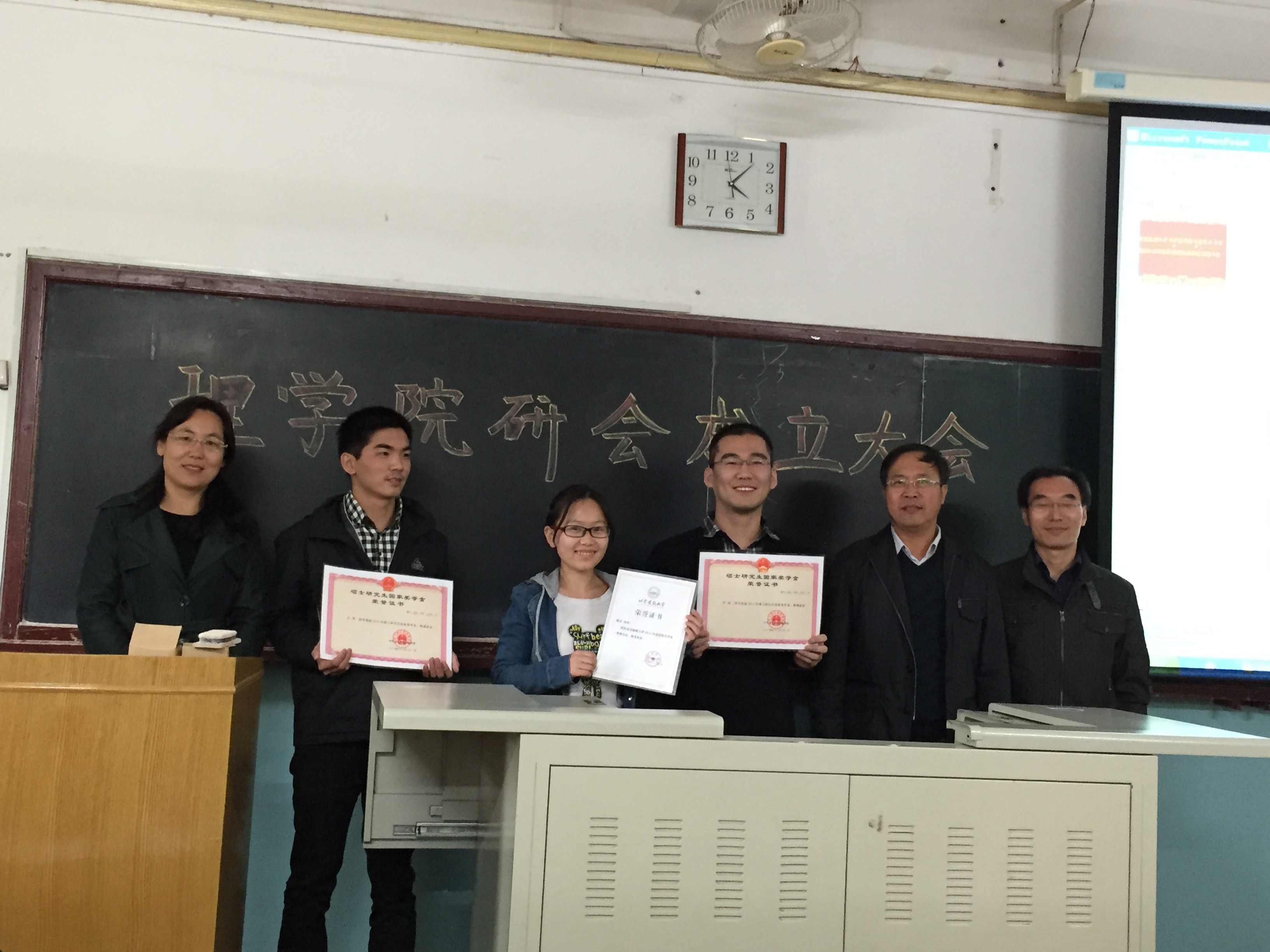 副院长梁昔明老师宣读《关于2014-2015学年研究生奖学金的表彰决定》,并向获得国家级奖学金获得者李超、张辉,获得一级奖学金的陈卓等同学颁发获奖证书以兹鼓励。