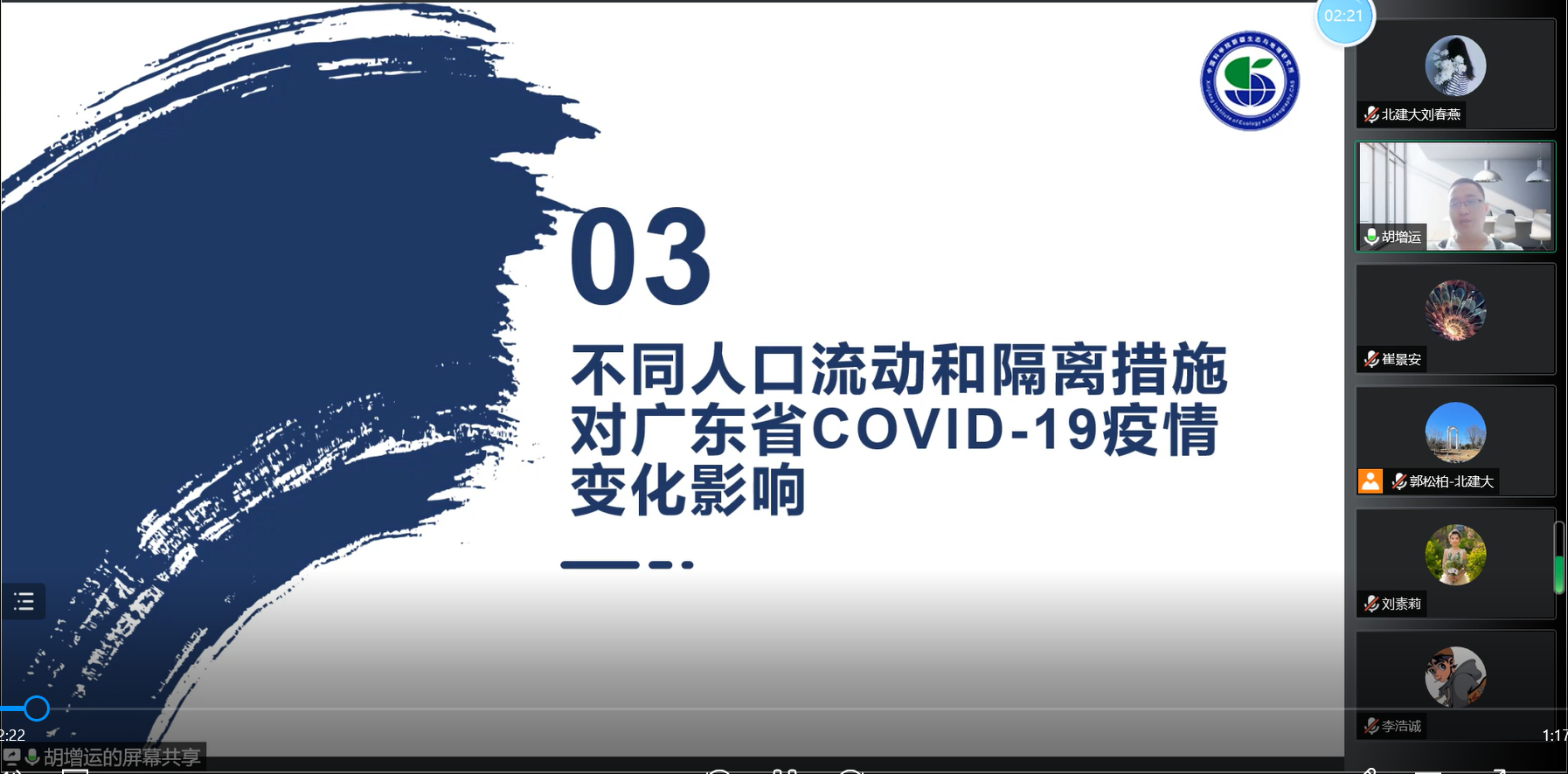 首先,胡增运研究员介绍了关于传染病动力学模型研究的最新进展。考虑到新冠疫情期间的复工复产,胡研究员带领团队研究了人口流动和隔离措施两方面对广东省、武汉市和全国疫情防控的影响,并采用移花接木方法对全球疫情风险进行了评估,以及气候变化对人类健康的影响。