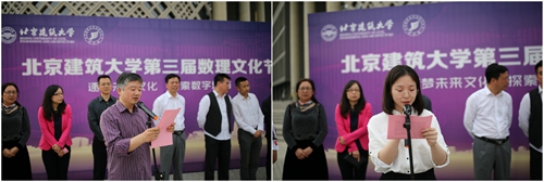 教师代表数学系何强发言,他为大家阐明了数理知识的重要性,并且解释了“数理文化节”活动的初衷,是为了把优秀的数理文化通过更新颖的形式展现给大家。之后获奖学生代表土木学院董贻晨同学发言,她感谢学校的栽培并鼓励大家好好学习数理文化知识。