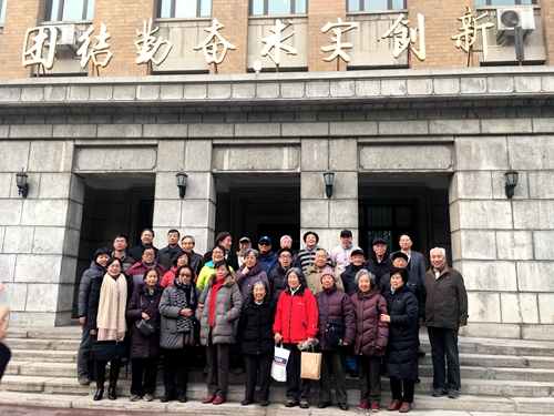 最后征求了退休教师对校院的意见或建议,并在教学楼前合影留念。