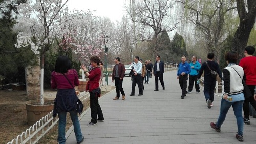 玉渊潭公园历史悠久,位置优越,游人如织。公园里已有早樱、碧桃等次第开放,点缀各处;湖岸杨柳青翠,依依傍水;近观拱桥长虹卧波,远看电视塔直矗苍穹,处处步步,都是美景。大家在繁重的教学工作之余亲近了自然,交流了感情,放松了身心。
