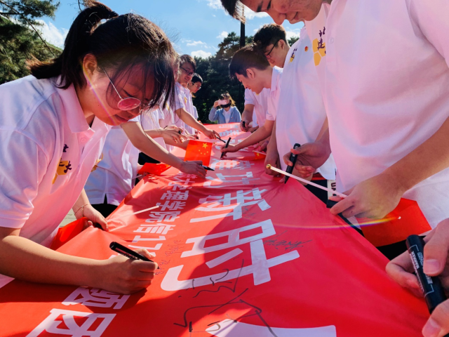最后,青年们在写有“青春心向党 建功新时代”的横幅上写下了自己的理想抱负以及名字。