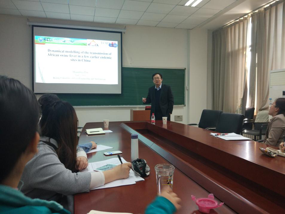 朱教授作了题目为“Dynamical modeling for assessing the transmission of African Swine Fever in China”的学术报告。报告中介绍了非洲猪瘟(ASF)在中国蔓延的数学模型。自2018年以来, ASF严重影响着人民的生活。而通过计算模型的基本再生数,朱教授分析了ASF的影响,进一步利用实际的案例阐述了采取控制措施之后ASF的蔓延情况。