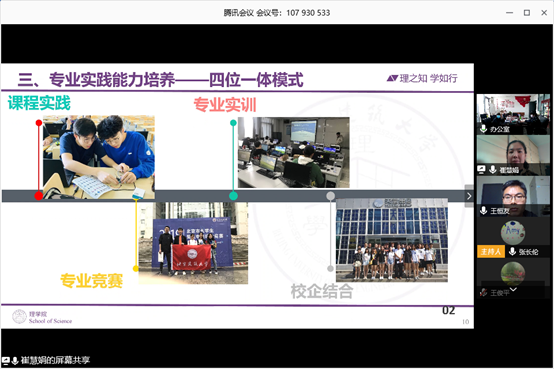 首先,信息与计算科学专业王恒友和电子信息科学与技术专业崔慧娟分别介绍两个专业在线招生直播初步方案,学院领导班子和各专业老师从专业培养目标、专业特色以及面向行业需求突出培养特色等方面给出针对性修改意见。副院长张长伦重申了专业招生直播的基本原则,对下一步的修改工作明确具体要求。