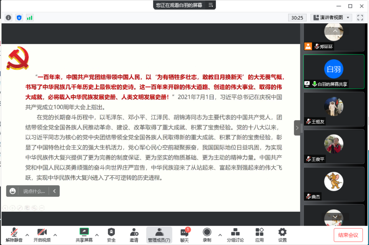 会上中心组成员结合学院实际进行了交流研讨。白羽书记表示要深入领会习近平总书记关于党的百年奋斗重大成就和历史经验的重要论述,深入学习贯彻党代会精神,立足岗位坚持社会主义办学方向,服务立德树人根本任务。