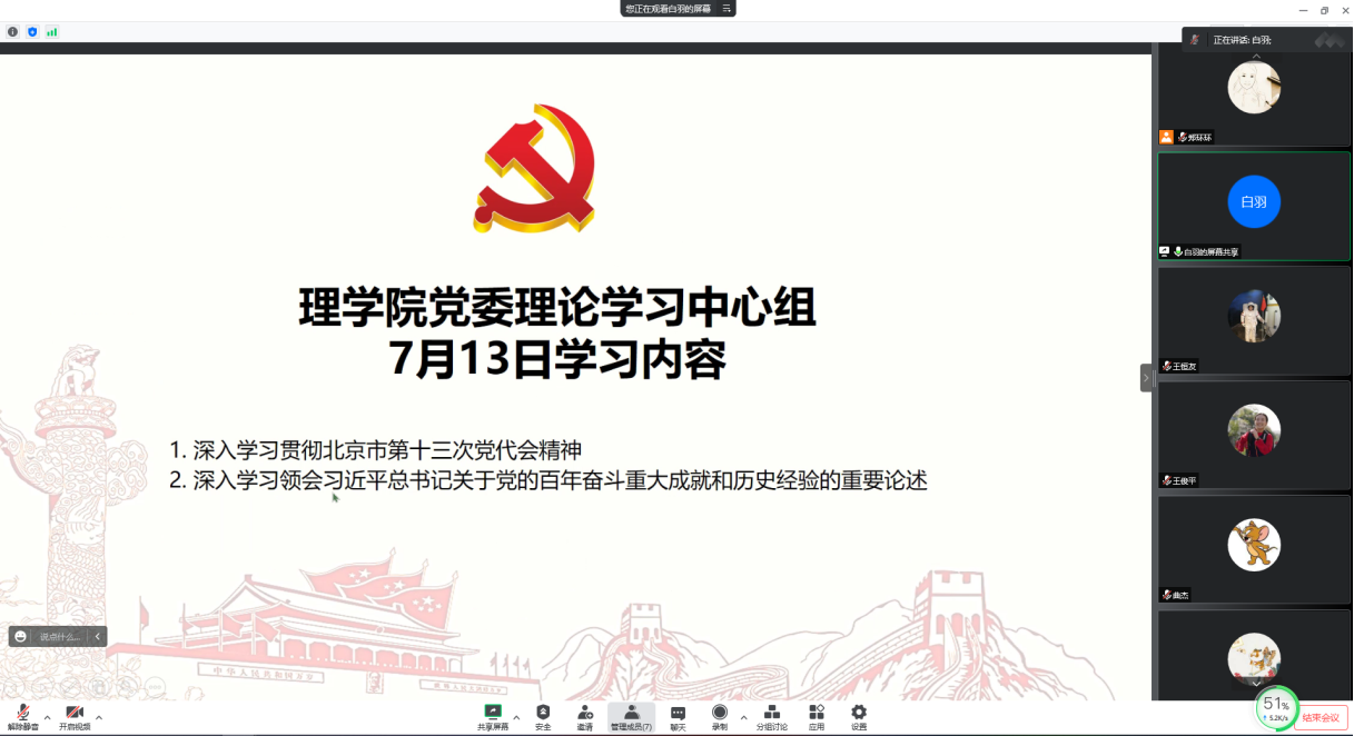 7月13日下午,淫妻小说 理论学习中心组召开学习会,集体学习领会北京市第十三次党代会精神和习近平总书记关于党的百年奋斗重大成就和历史经验的重要论述。党委书记白羽主持会议并进行领学。