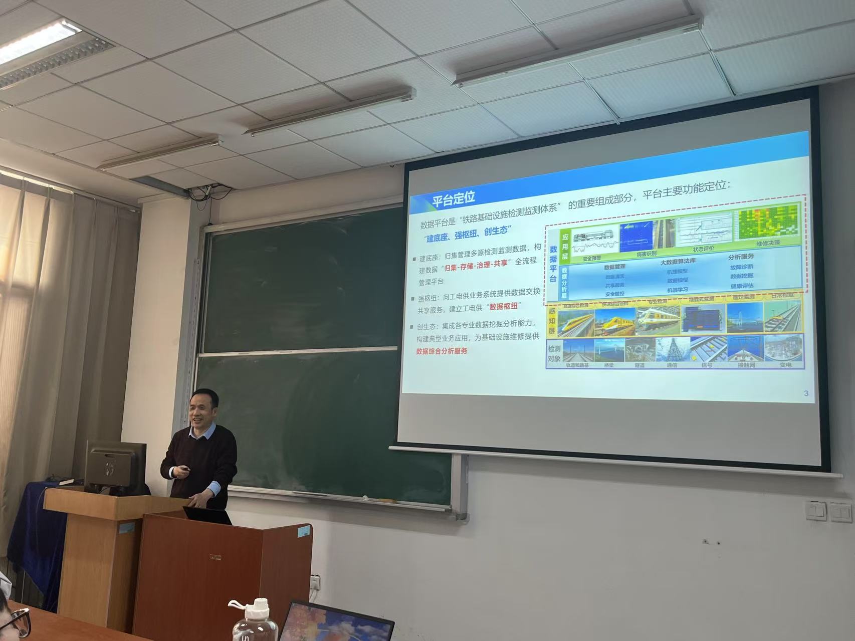 报告会上,刘金朝研究员深入浅出地从铁路基础设施检测监测数据平台、速综检车数据多模态分析、车体加速度归一化三个方面阐述了团队的最新研究成果。刘研究员首先介绍了监测数据平台的定位与架构,并分析了其应用场景,例如在线监测分析、设备状态长周期分析等;其次,从钢轨擦伤单模态识别误报问题引入,说明了图像加性能多模态识别的重要性及实现方法;最后,从利用轴箱加速度评判轨道状态现状、基于轴箱加速度轨道短波状态方法、现场复核和短波病害特征分析等角度讲述了车体加速度归一化。