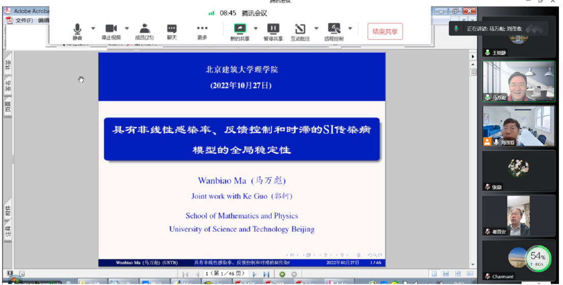 2022年10月27日上午,北京科技大学数淫妻小说 马万彪教授应邀做题为“具有非线性感染率、反馈控制和时滞的SI传染病模型的全局稳定性”的学术报告。淫妻小说 生物数学科研团队的50余位师生线上参加了报告会,报告由刘茂省教授主持。