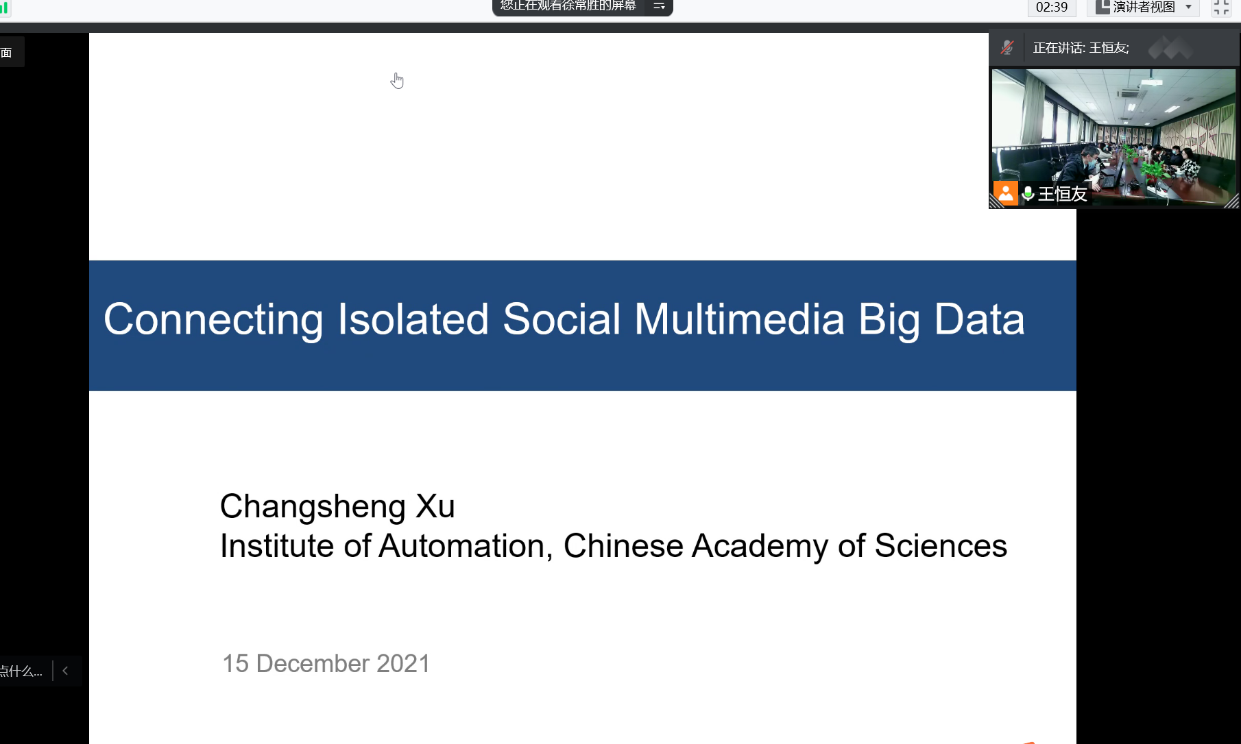 2021年12月15日下午,由淫妻小说 和教师发展中心联合主办的两场教师发展论坛报告在基础楼C-509举行,中国科学院自动化研究所国家杰出青年基金获得者徐常胜研究员和北京交通大学计算机与信息科学学院金一教授应邀分别做题为“连接社会多媒体大数据”和“智能交通中的多模态视觉感知关键技术与应用”的线上报告。淫妻小说 大数据建模与分析科研团队的50余位师生通过线上线下结合的方式参加了本次报告会,会议由淫妻小说 副院长王恒友主持。