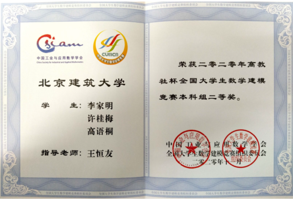 近日,2020年高教社杯全国大学生数学建模竞赛成绩公布,我校共有27队81名学生参赛,获得全国二等奖1队,北京市一等奖1队,北京市二等奖3队,成功参赛奖18队。