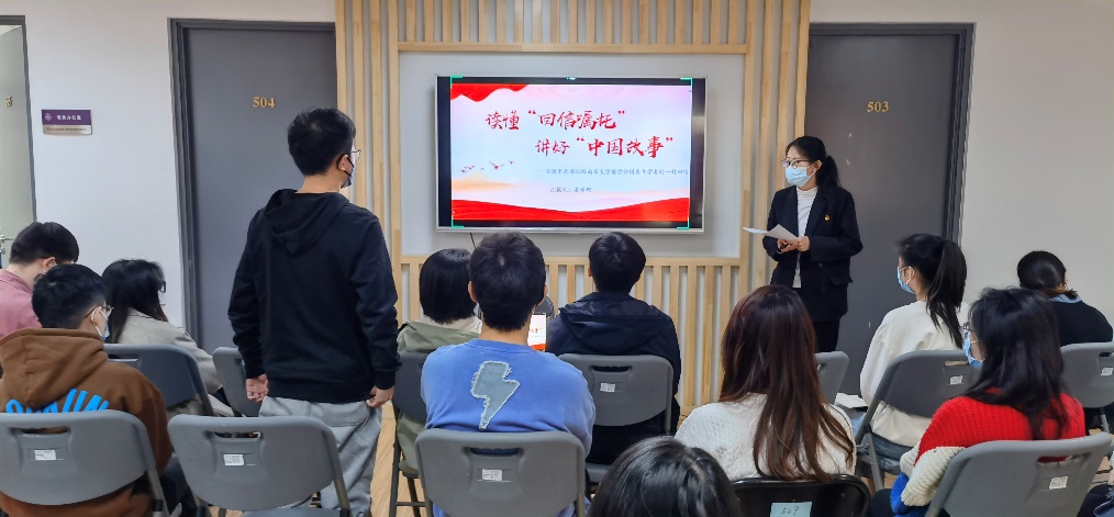 党员吴学珂以“读懂回信嘱托,讲好中国故事”为题,由习近平总书记给南京大学南京大学留学归国青年学者的回信展开,分享了当代青年归国报国的志向,激励大家坚定理想信念,为中华民族伟大复兴而奋斗。