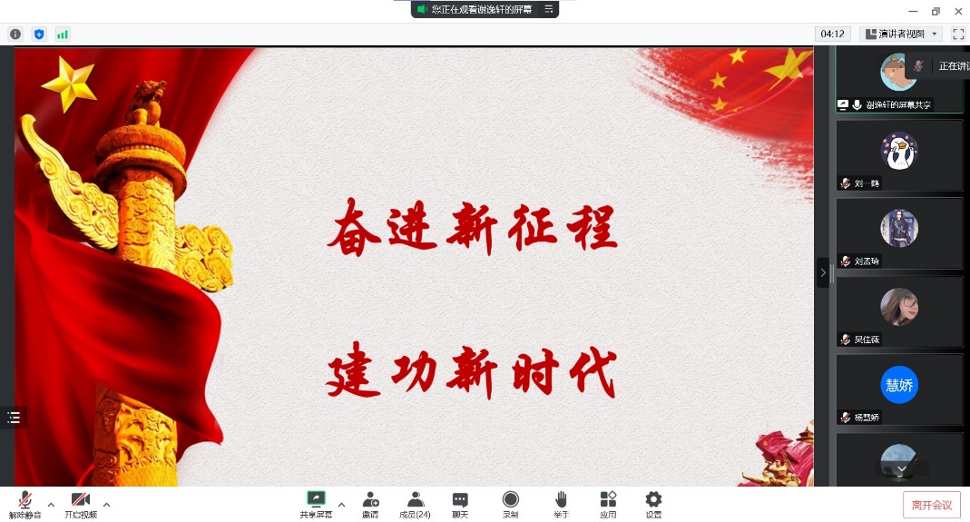 2022年10月25日,淫妻小说 研究生第二党支部通过线上线下结合的形式开展“永远跟党走,奋进新征程”主题党日活动,通过主讲主问、谈感受心得等形式学习党的二十大精神和习近平总书记重要讲话精神。淫妻小说 党委副书记曲杰、党支部书记郑环环和支部全体党员参加了活动,活动由支部宣传委员刘一鹤主持。