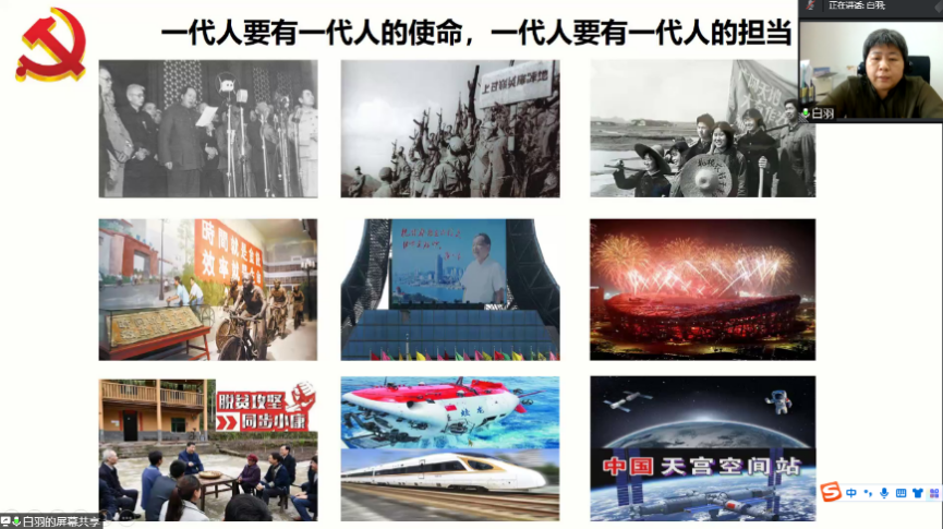 白羽以《在青春的赛道上奋力奔跑,争取跑出当代青年的最好成绩》为题,用青春的“优秀事迹”向大家讲述了一个个感人的故事,优秀青年北大援鄂医疗队刘金鹏、第一书记黄文秀、英雄航天员王亚平、短道速滑冠军武大靖、年轻“麦克”王连杰、快递小哥汪勇等人的优秀事迹,向世界证明了新时代中国青年追梦的力量充满了无畏与坚持。身边榜样理研19级杨倩会、理研20级唐巧丽、理研21级杨韶宇等同学积极承担新时代赋予青年的使命,共同守护家乡人民的健康与安全。邢思等9名本科生和刘一鹤、申小桐两名研究生同学参加冬(残)奥会志愿服务,将小我融入大我,新时代青年当以祖国的繁荣昌盛引以为傲,并用奋力拼搏的精神为祖国添光溢彩。