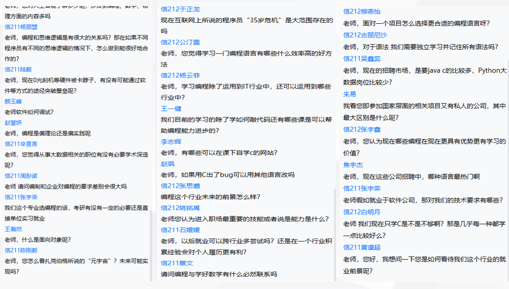 本次讲座是专业认识实践的一个重要环节,学生们通过和专家提问交流,对了解本专业特色、就业方向以及我校本专业方向的定位及就业前景有了更深入的了解与认识,为后续专业理论课程的学习奠定了必要的基础。