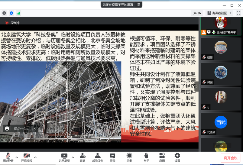 党课以冬奥精神开篇,引用了来源于《中国教育报》的《北京冬奥精神是高校育人的宝贵资源》,从中国气派、中国精神、中国品质和中国风格等方面介绍了博大精深、内涵丰富的北京冬奥精神。通过媒体报道《绽放,剪纸上的冰雪之花》和《冰天雪地里,数万座冬奥临时设施如何抗冻又保暖》形象展示了冬奥精神“更快、更高、更强”的口号。以点带面地分享我校部分二级学院教师团队对冬奥顺利举办所做出的贡献,分享将冬奥精神融入数学课程思政的优秀教学案例,激励大家永远积极向上、追逐梦想、奋勇拼搏。