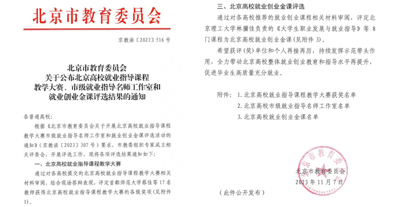 近年来,依托逐渐完善的“四维双线式”职涯教育辅导体系,教学团队在实践探索中不断创新、勇毅前行。团队先后荣获第三届全国高校教师教学创新大赛三等奖、市级高校教师教学创新大赛一等奖、北京高校就业创业金课、北京高校就业指导名师工作室等佳绩。下一步,就业指导中心将持续对标高质量充分就业这一目标,不断提高就业指导师资队伍专业化水平,提升教育辅导效能,助力我校就业工作再上新台阶。