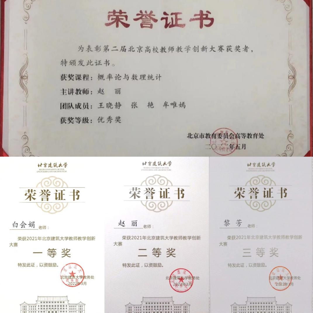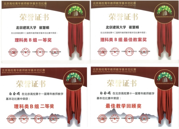 教师教学能力大幅提升。先后荣获北京高校青年教师教学基本功比赛一等奖1项,包揽最佳教案、最受学生欢迎、最佳教学反思、最佳现场展示和优秀指导教师等全部5项单项奖,二等奖1项和最佳教学反思奖;获全国高等学校教师图学与机械课程示范教学与创新教学法观摩竞赛图学类二等奖1项;首届北京高校大学数学课程教学创新示范交流活动中获一等奖2人,二等奖1人;第二届北京高校教师教学创新大赛获优秀奖1人;校青年教师教学基本功比赛获一等奖5人;校首届教学创新大赛获一等奖、二等奖和三等奖各1人;校首届教书育人“最美课堂”评比获一等奖、二等奖各1人;校教学优秀奖评选中获一等奖、二等奖和三等奖各2人;6位新入职教师教学能力考核合格,优秀3人。