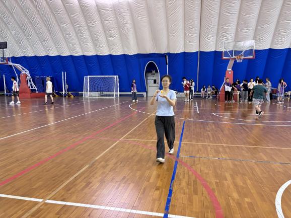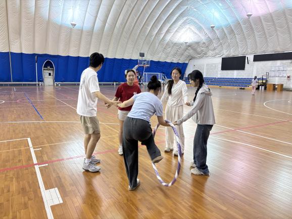 “一圈到底”项目要求队员们保持默契,呼啦圈在他们的身体间穿梭,共同完成任务。比赛时间内,各队成功完成呼啦圈穿过身体的圈数越多,排名越高。队员们紧密配合,呼啦圈在他们之间流畅穿梭,展现出团队间的默契和协作能力。