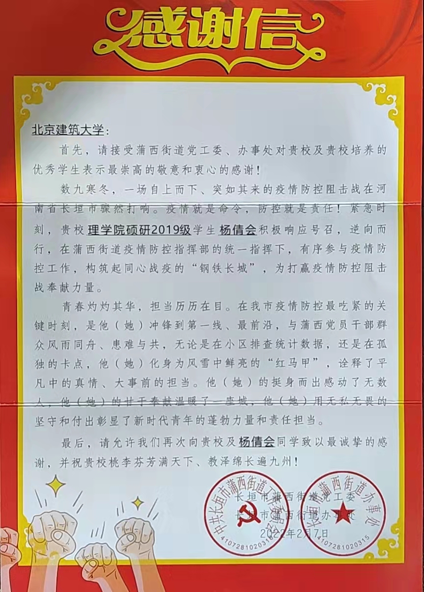 当地疫情散去后,中共长垣市蒲西街道工作委员会向学校发来感谢信,感谢杨倩会积极参与疫情防控工作,构筑起同心战疫的“钢铁长城”;感谢学校培养了优秀的学生,祝学校桃李芬芳满天下,教泽绵长遍九州!